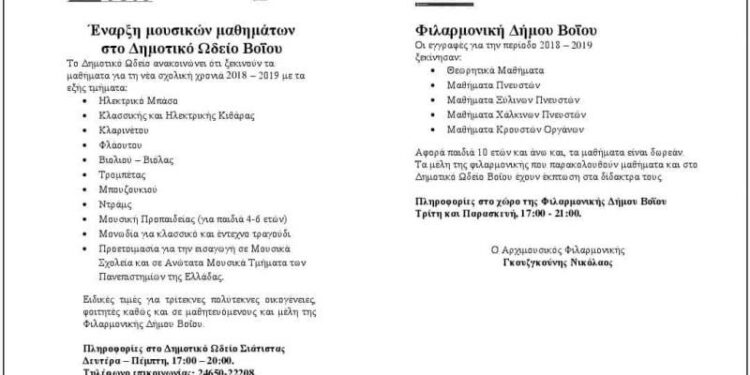 Έναρξη μουσικών μαθημάτων στο Δημοτικό Ωδείο Βοΐου και εγγραφές στη Φλαρμονική του Δήμου Βοΐου.
