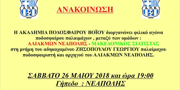 Το ΣΑΒΒΑΤΟ 26 ΜΑΙΟΥ 2018 στις 19:00 στο γήπεδο της Νεάπολης πραγματοποιείται φιλικός αγώνας μεταξύ Ακαδημίας Βοΐου και Μακεδονικού Σιάτιστας.