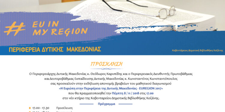 Ανοιχτή εκδήλωση απονομής βραβείων του μαθητικού διαγωνισμού «Η Ευρώπη στην Περιφέρεια της Δυτικής Μακεδονίας – EUREGION 2017» θα πραγματοποιηθεί την Πέμπτη 08 Νοεμβρίου 2018, στις 17:00, στο νέο κτήριο της Κοβενταρείου Δημοτικής Βιβλιοθήκης Κοζάνης.