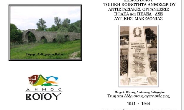 Ο Δήμος Βοΐου, η Τοπική Κοινότητα Ανθοχωρίου και οι Αντιστασιακές Οργανώσεις ΠΟΑΕΑ και ΠΕΑΕΑ – ΔΣΕ σας προσκαλούν να παρευρεθείτε την Κυριακή 12 Αυγούστου 2018 ώρα 11:30 , στο χώρο του Μνημείου Εθνικής Αντίστασης Ανθοχωρίου Βοΐου για να αποδώσουμε φόρο τιμής και ευγνωμοσύνης στους άοπλους πολίτες του Ανθοχωρίου που έδωσαν τη ζωή τους, για την πατρίδα και τη λευτεριά της.