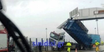 Σύμφωνα με την εφημερίδα «Συνείδηση», οι ισχυροί άνεμοι σήκωσαν την καρότσα της μεγάλης νταλίκας και την «κάρφωσαν» στις πινακίδες σήμανσης της γέφυρας!