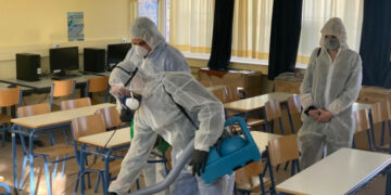 Οι απολυμάνσεις στους εσωτερικούς και εξωτερικούς χώρους των σχολικών κτηρίων πραγματοποιήθηκαν από ειδικό συνεργείο, με τη μέριμνα του προέδρου της Δευτεροβάθμιας Σχολικής Επιτροπής, Γιώργου Ευκολίδη.