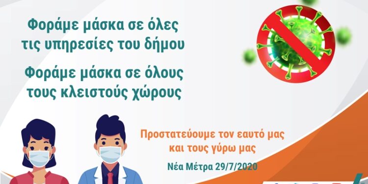 Σύμφωνα με την εγκύκλιο του Υπουργείου Εσωτερικών ΔΙΔΑΔ/Φ.69/123/14268 που εκδόθηκε στις 29/07/2020, καθίσταται υποχρεωτική η χρήση μάσκας σε δημόσιες υπηρεσίες, στο πλαίσιο των έκτακτων μέτρων αντιμετώπισης του κινδύνου διασποράς του κορωνοϊού COVID-19.