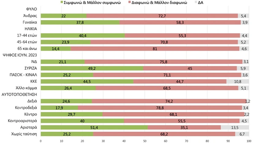 Στον αντίποδα οι διαφωνούντες σε μια τέτοια προοπτική φθάνουν στο 42,5%. Το ποσοστό των συναιντούντων είναι το μεγαλύτερο της τελευταίας εξαετίας, καθώς σύμφωνα με αντίστοιχες έρευνες που έγιναν τα προηγούμενα από τη «Διανέοσις», το 2018 το ποσοστό όσων συμφωνούσαν ήταν 39,3%, έναν χρόνο αργότερα έγινε 40,8% και από το 51,7% που ήταν το 2022, στις αρχές του 2024 έγινε άνετη πλειοψηφία.