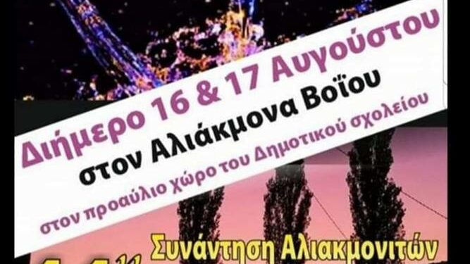 Διήμερο εκδηλώσεων στον Αλιάκμονα. Παρασκευή 16 Αυγούστου 2019, 11ο Πάρτυ Νεολαίας με το DJ Dimi. (ώρα έναρξης 22:30) Σάββατο 17 Αυγούστου 2019, 11η Συνάντηση Αλιακμονιτών (φίλων , γνωστών και συγγενών) !(ώρα έναρξης 20:30)