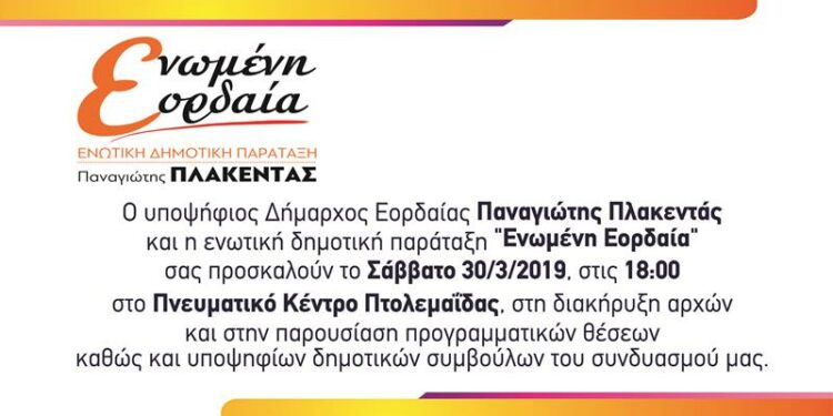Ο Υποψήφιος Δήμαρχος Εορδαίας Παναγιώτης Πλακεντάς και η ενωτική δημοτική παράταξη “ΕνωμένηΕορδαία” σας προσκαλούν το Σάββατο 30 Μαρτίου 2019 στις 18:00 στο Πνευματικό Κέντρο Πτολεμαΐδας, στη διακήρυξη αρχών και στην παρουσίαση προγραμματικών θέσεων καθώς και υποψηφίων δημοτικών συμβούλων του συνδυασμού μας.
