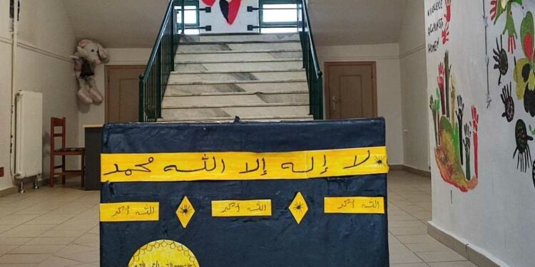 Στην παραπάνω φωτογραφία απεικονίζεται μια μικρογραφία της Μέκκα, κατασκευασμένη από τα κορίτσια της δομής, της ιερής δηλαδή πόλης του Ισλάμ.
