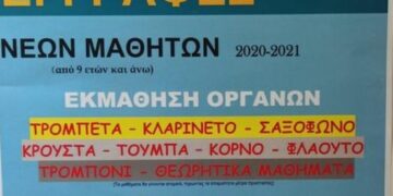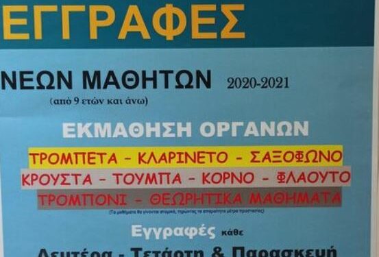 Εγγραφές κάθε Δευτέρα, Τετάρτη και Παρασκευή απόγευμα ώρα 5:30 με 8:00 μ.μ.στο κτήριο της Φιλαρμονικής.