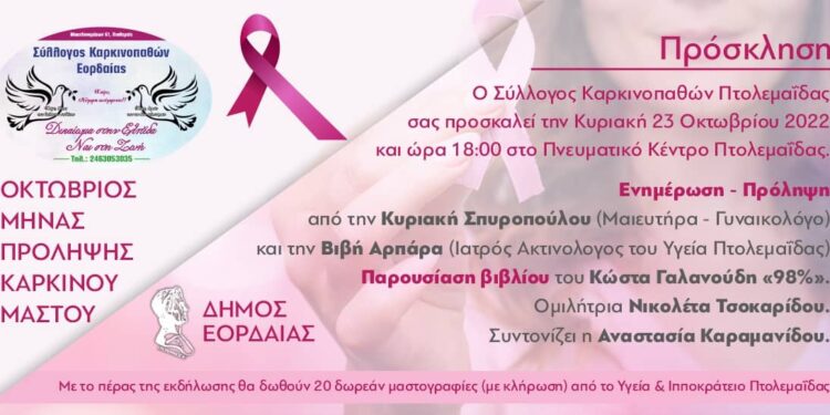 Μετά το πέρας της εκδήλωσης και κατόπιν κλήρωσης, θα δοθούν 10 δωρεάν μαστογραφίες από τα Διαγνωστικά Κέντρα «Υγεία» και «Ιπποκράτειο» Πτολεμαΐδας.