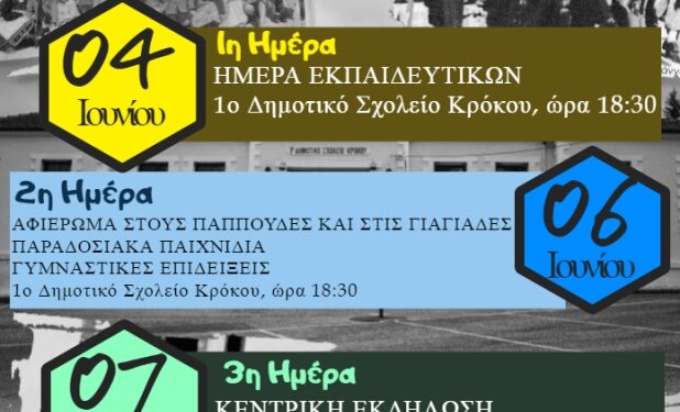 Ο Σύλλογος Διδασκόντων του Σχολείου, σε συνεργασία με το Σύλλογο Γονέων και Κηδεμόνων, τον Πολιτιστικό Σύλλογο Κρόκου «Ιωακείμ Λιούλιας», την Τοπική Κοινότητα Κρόκου, οργανώνουμε εκδηλώσεις για να γιορτάσουμε την επέτειο των εκατό χρόνων: