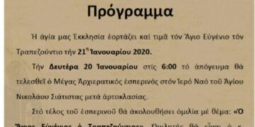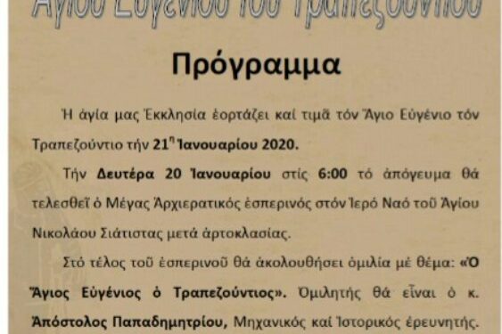 Η Αγία μας Εκκλησία εορτάζει και τιμά τον Άγιο Ευγένιο τον Τραπεζούντιο την 21η Ιανουαρίου 2020.