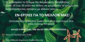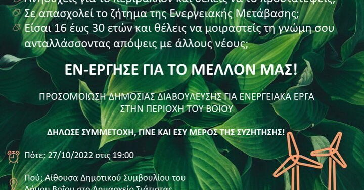Αν είσαι νέος 16-30 ετών και επιθυμείς να ενημερωθείς για την ενεργειακή μετάβαση συμμετέχοντας με βιωματικό τρόπο στην συζήτηση για την ενέργεια και την προστασία του περιβάλλοντος, δήλωσε συμμετοχή στη φόρμα: