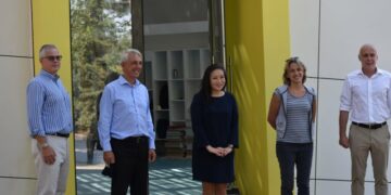 Στην είσοδο του νέου κτιρίου Anna Papageorgiou STEM Center. Από αριστερά Peter Chresanthakes, Vice President of Institutional Advancement του Κολλεγίου Ανατόλια, Δρ Πάνος Βλάχος, Πρόεδρος Κολλεγίου Ανατόλια, Elizabeth K. Lee, Γενική Πρόξενος των ΗΠΑ στη Θεσσαλονίκη, Πηγή Παχίνη, αρχιτέκτονας και υπεύθυνη του εργοταξίου, Tομή ΑΒΕΤΕ, Γιάννης Τσορμπατζόγλου, Chief Operating Officer for Planning & Innovation & Vice President for Cross Divisional Programs του Κολλεγίου Ανατόλια.