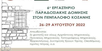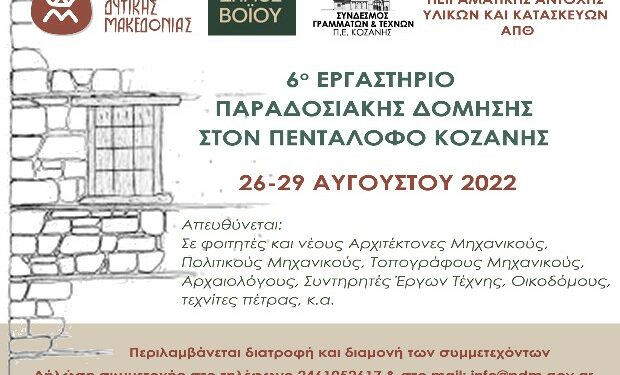 Η Περιφέρεια Δυτικής Μακεδονίας, ο Δήμος Βοΐου, ο Σύνδεσμος Γραμμάτων και Τεχνών Π.Ε. Κοζάνης και το Εργαστήριο Πειραματικής Αντοχής Υλικών και Κατασκευών του Αριστοτελείου Πανεπιστημίου Θεσσαλονίκης, σας προσκαλούν στο 6ο Εργαστήριο Παραδοσιακής Δόμησης που θα πραγματοποιηθεί στον Πεντάλοφο Κοζάνης, από τις 26 έως 29 Αυγούστου.