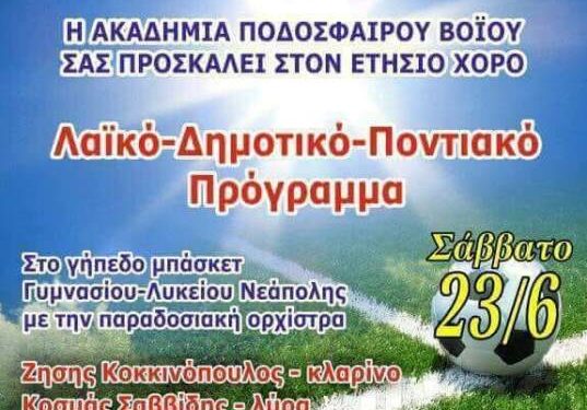 Η Ακαδημία Ποδοσφαίρου Βοΐου “Η Ένωση” σας προσκαλεί στον ετήσιο χορό που θα πραγματοποιήσει, το Σάββατο 23 Ιουνίου 2018, στο γήπεδο μπάσκετ Γυμνασίου Λυκείου Νεάπολης.