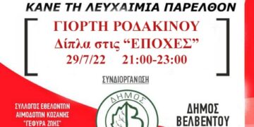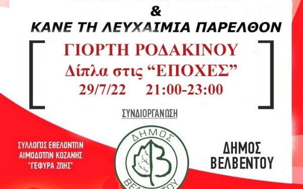 Τα στελέχη του συλλόγου εθελοντών γέφυρα ζωής, θα βρίσκονται την Παρασκευή 29/7/2022 από ώρα 21:00 έως 23:00 στην πλατεία του Βελβεντού, δίπλα στο κατάστημα ΕΠΟΧΕΣ για λήψη δειγμάτων για δότες μυελού των οστών.