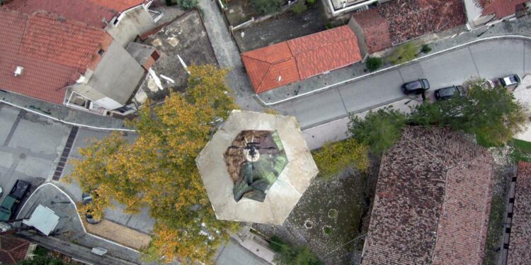 Φωτογραφίες που τραβήχτηκαν με drone, δείχνουν το μισό σκέπαστρο ξεκολλημένο.