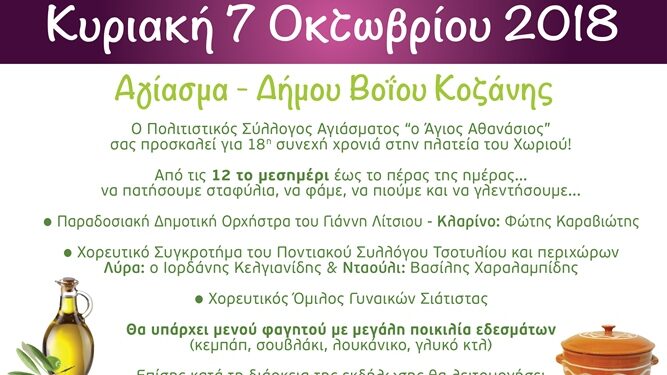Η 18η γιορτή κρασιού στο Αγίασμα, θα πραγματοποιηθεί την Κυριακή 7 Οκτωβρίου.