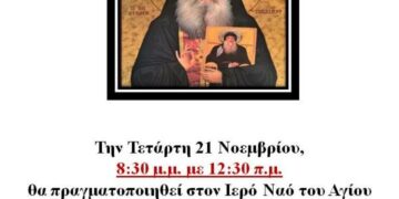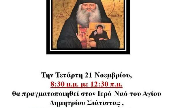 Την Τετάρτη 21 Νοεμβρίου, 8:30 μ.μ. με 12:30 π.μ. θα πραγματοποιηθεί στον Ιερό Ναό του Αγίου Δημητρίου Σιάτιστας ,