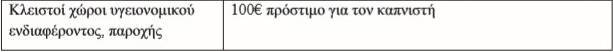 Το κατώτερο πρόστιμο των 50 ευρώ που πλήρωνε μέχρι σήμερα ο καπνιστής γίνεται 100 ευρώ και ισχύει για κάθε παράβαση σε όλους τους κλειστούς χώρους υγειονομικού ενδιαφέροντος όποιας έκτασης κι αν είναι, σε όλους τους κλειστούς χώρους εργασίας, σε όλα τα μέσα μαζικής μεταφοράς, τους σταθμούς μεταφορικών μέσων και επιβατικών σταθμών λιμένων, τα αεροδρόμια εκτός των ειδικών χώρων καπνιστών, τους δημόσιους χώρους εργασίας καθώς και αναμονής δημοσίων υπηρεσιών.
