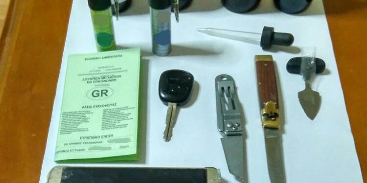 - 65χρονος ημεδαπός, διότι σε έλεγχο που πραγματοποιήθηκε σε Ι.Χ.Ε αυτοκίνητο ιδιοκτησίας του, βρέθηκαν στην κατοχή του -500- ml υγρής μεθαδόνης, -3- μαχαίρια, -2- συσκευές εκτόξευσης αερίου, -1- σκεύος μέτρησης και χρήσης υγρής μεθαδόνης,