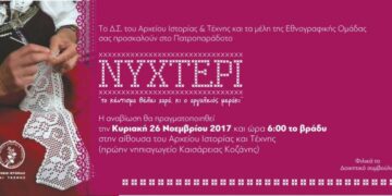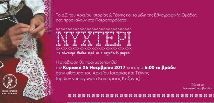 Το Αρχείο Ιστορίας & Τέχνης και τα μέλη της Εθνογραφικής του Ομάδας αναβιώνουν, για άλλη μια χρονιά, το Πατροπαράδοτο «ΝΥΧΤΕΡΙ» με γενικό τίτλο, ¨το κέντισμα θέλει χαρά κι ο αργαλειός μεράκι¨