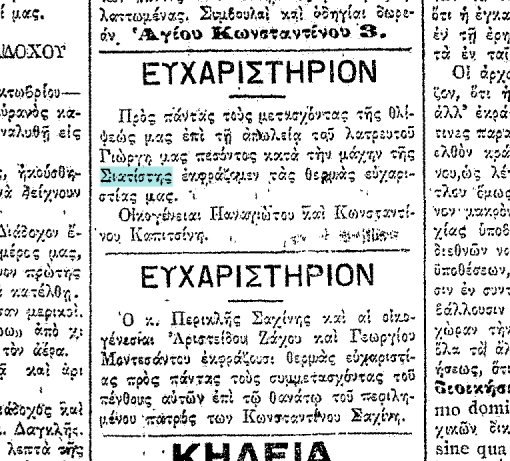 Στην περίοδο της 4η Νοεμβρίου, είχα αναρτήσει το απόκομμα της εφημερίδας “ΕΜΠΡΟΣ” του 1912. Ήταν το ευχαριστήριο της οικογένειας του ήρωα Γεώργιου Καπιτσίνη, προς όσους της συμπαραστάθηκαν στο πένθος της. Η Καλλιόπη Μπόντα, που μου το απέστειλε, με συμβούλεψε να διαβάσω και την αμέσως από κάτω ανακοίνωση. Εκείνες τις μέρες πέθανε και ο Κωνσταντίνος Σαχίνης.