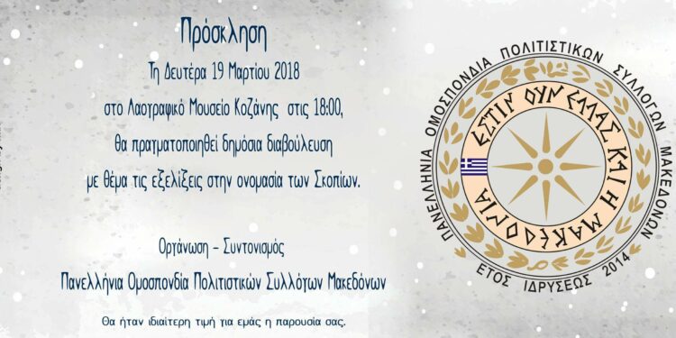 Η Πανελλήνια Ομοσπονδία Πολιτιστικών Συλλόγων Μακεδόνων σε συνεργασία με τον Σύνδεσμο Γραμμάτων και Τεχνών Π. Ε. Κοζάνης, διοργανώνουν ΔΗΜΟΣΙΑ ΔΙΑΒΟΥΛΕΥΣΗ με θέμα: «ΟΙ ΕΞΕΛΙΞΕΙΣ ΣΤΟ ΘΕΜΑ ΤΗΣ ΟΝΟΜΑΣΙΑΣ ΤΩΝ ΣΚΟΠΙΩΝ».