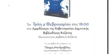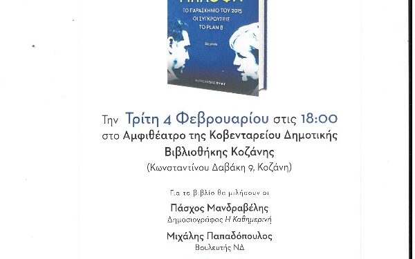 Παρουσίαση του βιβλίου Η Τελευταία Μπλόφα των κυρίων Βαρβιτσιώτη και Δενδρινού, θα πραγματοποιηθεί την Τρίτη 4 Φεβρουαρίου στις 18.00 στο Αμφιθέατρο της Κοβεντάρειου Δημοτικής Βιβλιοθήκης Κοζάνης.