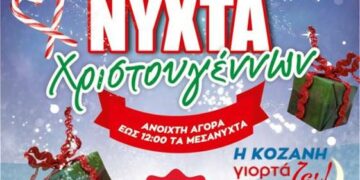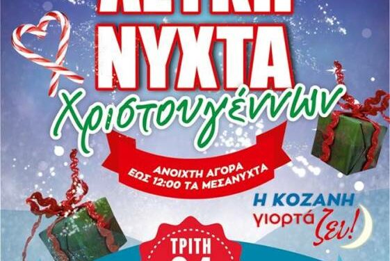 Κατά τη διάρκεια αυτής της βραδιάς τα καταστήματα θα παραμείνουνανοιχτά έως τις 12 τα μεσάνυχτα, με είδη σε προνομιακές τιμές, μεγάλες προσφορές. Την ίδια μέρα ο Δήμος Κοζάνης θα φωταγωγήσει το Χριστουγεννιάτικο δέντρο στην κεντρική πλατεία Κοζάνης, ενώ παράλληλα θα δοθεί μεγάλη εορταστική συναυλία με την Μαρίνα Σάττι και τους Fones, ενώ παρουσιάζει ο Γιώργος Χατζηπαύλου!