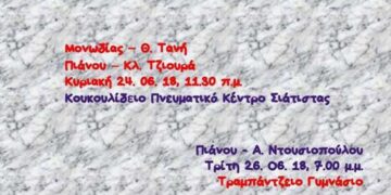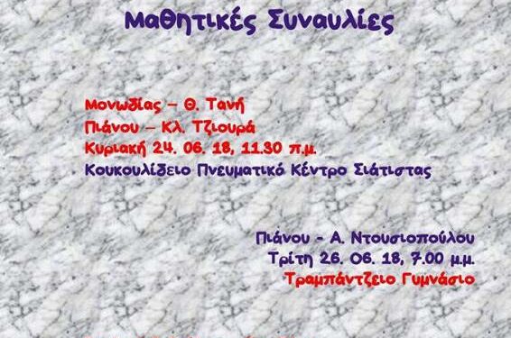 Μαθητικές Συναυλίες από το Δημοτικό Ωδείο Σιάτιστας την Κυριακή 24 Ιουνίου και την Τρίτη 26 Ιουνίου 2018, στο Κουκουλίδειο Πνευματικό Κέντρο Σιάτιστας.