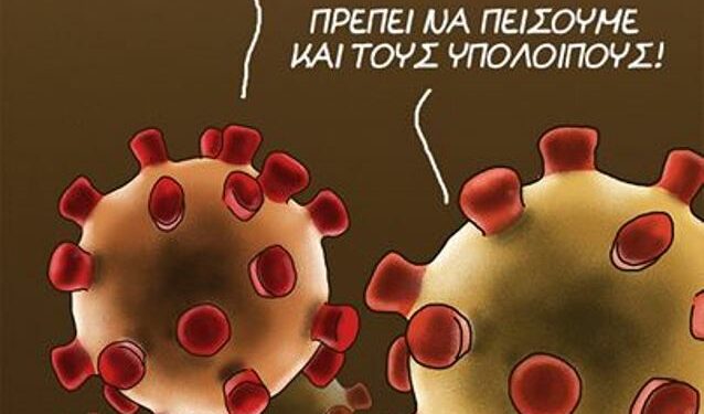 «Είναι πολλοί που πιστεύουν ότι δεν υπάρχουμε» σχολίαζει ο ένας «κορωνοϊός» με τον δεύτερο που πρωταγωνιστεί στο σκίτσο να απαντά: «Πρέπει να πείσουμε και τους υπόλοιπους».