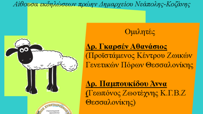 Ο Αγροτικός-Κτηνοτροφικός Συνεταιρίσμος Βοΐου στο πλαίσιο υλοποίησης του προγράμματος “Γενετικοί πόροι στην Κτηνοτροφία” (Δράση 10.2., μέτρο 10 του ΠΑΑ 2014-2020), με στόχο την αναγνώριση και πιστοποίηση μιας σπάνιας ελληνικής φυλής προβάτου που ζει στην περιοχή στης Δυτικής Μακεδονίας και ονομάζεται Φλώρινας-Πελαγονίας, σε συνεργασία με το Υπουργείο Αγροτικής Ανάπτυξης & Τροφίμων και το Κέντρο Γενετικής Βελτίωσης Θεσσαλονίκης σας προσκαλεί την Τρίτη 23 Ιανουαρίου 2018 σε ημερίδα με θέμα: Ελληνικές φυλές προβάτων (Πρόβατο Φλώρινας – Πελαγονίας).