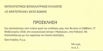 Ο Εκπολιτιστικός Φυσιολατρικός Σύλλογος Ο Αριστοτέλης Κάτω Κώμης σας προσκαλεί στον ετήσιο χορό του συλλόγου το Σάββατο 17 Φεβρουαρίου 2018 στο οικογενειακό κέντρο Υδρόγειος στη Ροδιανή.