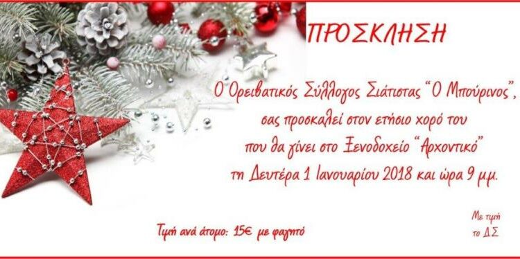 Ο Ορειβατικός Σύλλογος Σιάτιστας “Ο Μπούρινος” σας προσκαλεί στον ετήσιο χορό του που θα γίνει στο Ξενοδοχείο Αρχοντικό τη Δευτέρα 1 Ιανουαρίου 2018 και ώρα 9 μ.μ.