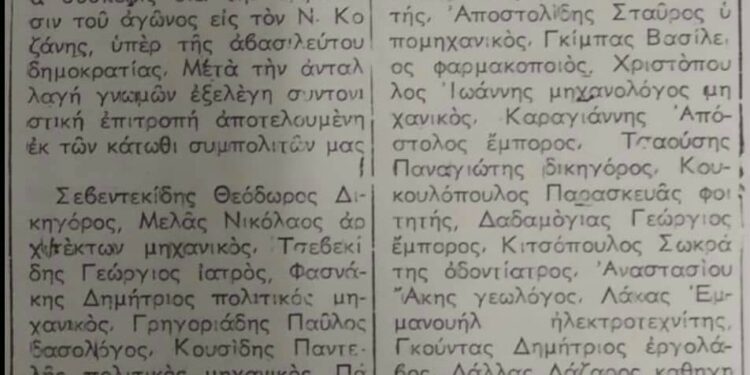 Ως συμβολή στην τοπική μας Ιστορία παραθέτω το δημοσίευμα της εφημερίδας ΘΑΡΡΟΣ 1/12/1974 για την επιτροπή υπέρ της Αβασιλεύτου Δημοκρατίας στην Κοζανη.