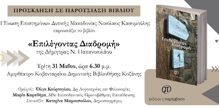 Η παρουσίαση του βιβλίου με τίτλο «Επιλέγοντας Διαδρομή» της Δήμητρας Παπανικολάου θα πραγματοποιηθεί στις 31 Μαΐου στο αμφιθέατρο της Κοβενταρείου Δημοτικής Βιβλιοθήκης Κοζάνης.