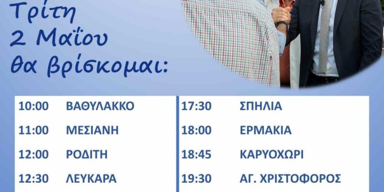 Ο υπ. Βουλευτής της ΝΔ Π.Ε. Κοζάνης Στάθης Κωνσταντινίδης θα επισκεφθεί την Τρίτη 2 Μαΐου 2023 τις πρωινές ώρες τον Βαθύλακκο, την Μεσιανή, τον Ροδίτη, τα Λεύκαρα και τα Ίμερα και το απόγευμα την Σπηλιά, την Ερμακιά, το Καρυοχώρι, τον Άγιο Χριστόφορο και το Ανατολικό.