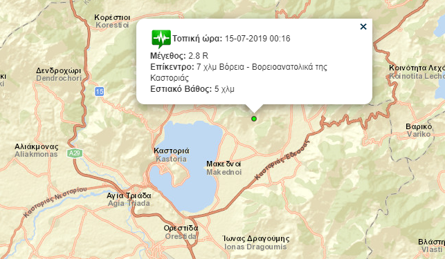 Σεισμική δόνηση μεγέθους 2.8 της Κλίμακας Ρίχτερ, σημειώθηκε στις 00:16 τα μεσάνυχτα, Βορειοανατολικά της Καστοριάς, με επίκεντρο μεταξύ Φωτεινής και Μεταμόρφωσης.