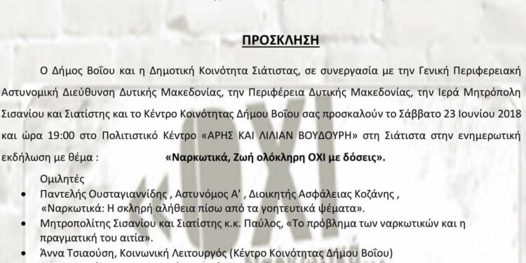 Ο Δήμος Βοΐου και η Δημοτική Κοινότητα Σιάτιστας, σε συνεργασία με την Γενική Περιφερειακή Αστυνομική Διεύθυνση Δυτικής Μακεδονίας, την Περιφέρεια Δυτικής Μακεδονίας, την Ιερά Μητρόπολη Σισανίου και Σιατίστης και το Κέντρο Κοινότητας Δήμου Βοΐου σας προσκαλούν το Σάββατο 23 Ιουνίου 2018 και ώρα 19:00 στο Πολιτιστικό Κέντρο «ΑΡΗΣ ΚΑΙ ΛΙΛΙΑΝ ΒΟΥΔΟΥΡΗ» στη Σιάτιστα στην ενημερωτική εκδήλωση με θέμα : «Ναρκωτικά, Ζωή ολόκληρη ΟΧΙ με δόσεις».