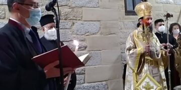 Οι πιστοί παρέμειναν έξω από το Ναό περιμετρικά, ενώ οι καμάρες του Ναού φάνταζαν επιβλητικές.