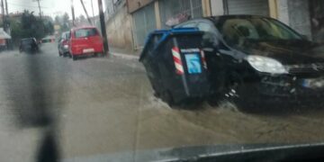 Δύο κάδοι ανακύκλωσης παρασύρθηκαν και σταμάτησαν πάνω σε παρκαρισμένο αυτοκίνητο.