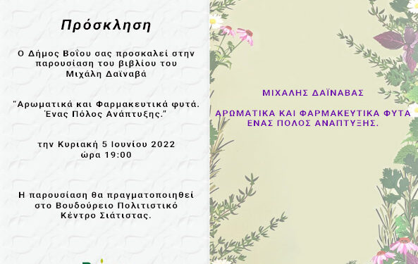Η Παρουσίαση του βιβλίου του Μιχάλη Δαϊναβά για τα φυτά του Μπούρινου, θα πραγματοποιηθεί την Κυριακή 5 Ιουνίου στο Πολιτιστικό Κέντρο Άρης και Λίλιαν Βουδούρη στη Σιάτιστα .