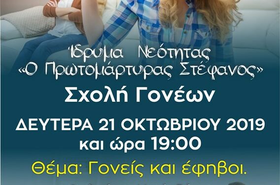 Την Δευτέρα 21 Οκτωβρίου 2019 και ώρα 19:00 θα πραγματοποιηθεί η Σχολή Γονέων, στην Αίθουσα Αλεξάνδρα Παπαγεωργίου, με θέμα: Γονείς και Έφηβοι.