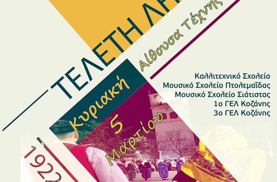 Σας προσκαλούμε στην Τελετή Λήξης του Επετειακού Έτους «100 χρόνια Μνήμης Προσφυγικού Ελληνισμού Δήμου Κοζάνης», την Κυριακή 5 Μαρτίου 2023, στις 11:00 π.μ., στην Αίθουσα Τέχνης.