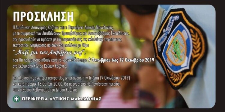 Η ημερίδα εντάσσεται στο πλαίσιο της τετραήμερης εκστρατείας ενημέρωσης παιδιών και ενηλίκων που θα πραγματοποιήσει η Διεύθυνση Αστυνομίας Κοζάνης από κοινού με την Περιφέρεια Δυτικής Μακεδονίας, με τη συμμετοχή των Διευθύνσεων Πρωτοβάθμιας και Δευτεροβάθμιας Εκπαίδευσης Π.Ε. Κοζάνης, από Τετάρτη (9/10/2019) έως Παρασκευή (11/10/2019) στο Εκθεσιακό Κέντρο Κοίλων Κοζάνης.
