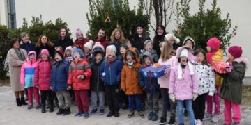 Το δέντρο στολίστηκε με τις παιδικές δημιουργικές χειροτεχνίες των μικρών μαθητών, που επιμελήθηκαν οι δάσκαλοί τους στο σχολείο, με υλικά που τους χορήγησε η Εφορεία Αρχαιοτήτων Κοζάνης.