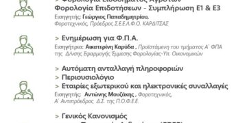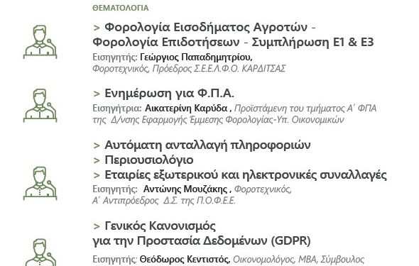 Την Κυριακή και ώρα 10:00, ο κ. Γεώργιος Παπαδημητρίου Πρόεδρος Σ.Ε.Ε.Λ.Φ.Ο. Καρδίτσας , η κ. Αικατερίνη Καρύδα Προϊσταμένη του Τμήματος Α’ ΦΠΑ του Υπουργείου Οικονομικών, ο κ. Αντώνης Μουζάκης Φοροτεχνικός Α’ Αντιπρόεδρος Δ.Σ. της Π.Ο.Φ.Ε.Ε. και ο κ. Θεόδωρος Κεντιστός, Οικονομολόγος, Ειδικός Συνεργάτης Π.Ο.Φ.Ε.Ε. θα μιλήσουν για θέματα φορολογίας αγροτών, ΦΠΑ επιχειρήσεων, περιουσιολόγιο και θέματα προστασίας προσωπικών δεδομένων.