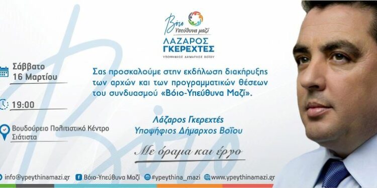 Το Σάββατο 16 Μαρτίου στις 7μμ στο Βουδούρειο θα πραγματοποιηθεί η εκδήλωση διακήρυξης των αρχών και των προγραμματικών θέσεων του συνδυασμού «Βόιο-Υπεύθυνα Μαζί» του Λάζαρου Γκερεχτέ.