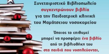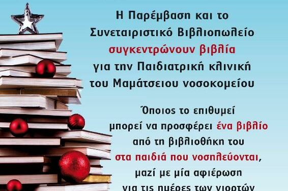 Μέχρι την Πέμπτη 20 Δεκεμβρίου συνεχίζεται η συγκέντρωση βιβλίων για την Παιδιατρική Κλινική του Μαμάτσειου Νοσοκομείου, προκειμένου αυτά να προσφερθούν στα παιδιά που νοσηλεύονται, ώστε να απασχοληθούν ευχάριστα και δημιουργικά, κατά το διάστημα των Χριστουγέννων. Όποιος το επιθυμεί μπορεί να προσφέρει ένα βιβλίο από τη βιβλιοθήκη του, μαζί με μία αφιέρωση για τις ημέρες των γιορτών.